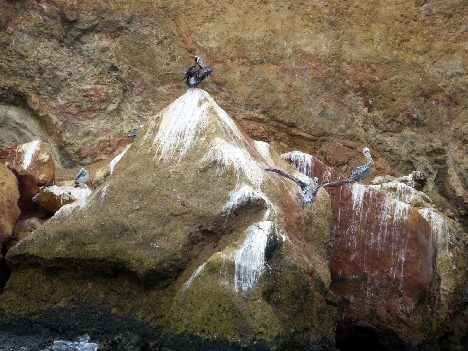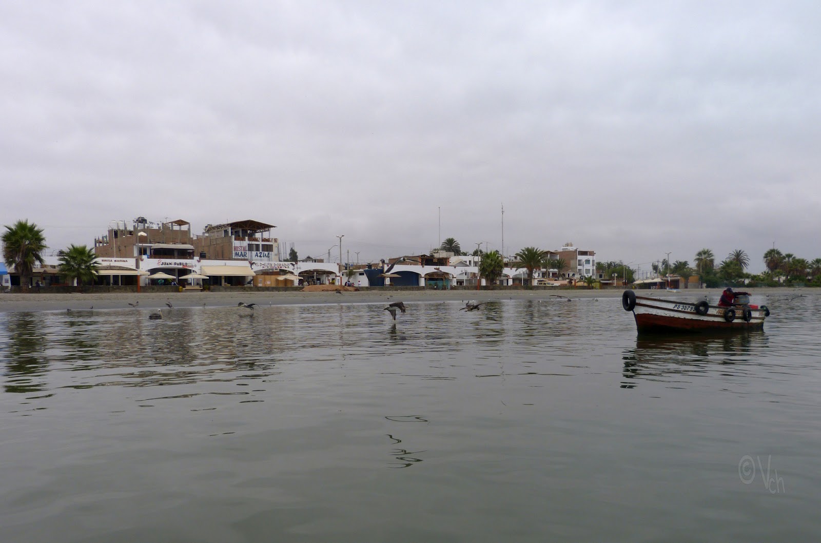 En la costa de la península de Paracas, y durante el camino, desde que se sale de la playa, donde numerosos barcos de pesca atracan, ya se pueden divisar numerosas bandadas de aves marinas, como gaviotas, y los enormes pelícanos peruanos de la zona, que volaban dibujando curiosas formaciones en el cielo grisáceo, amenazante de lluvia, que nos tocó esa mañana.