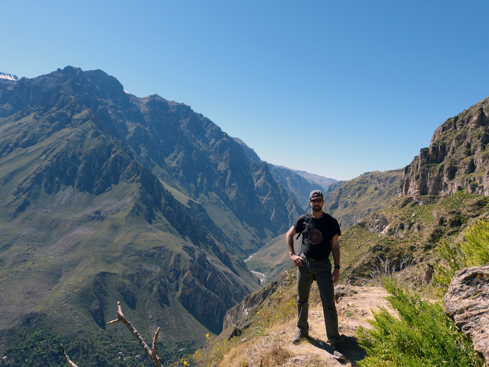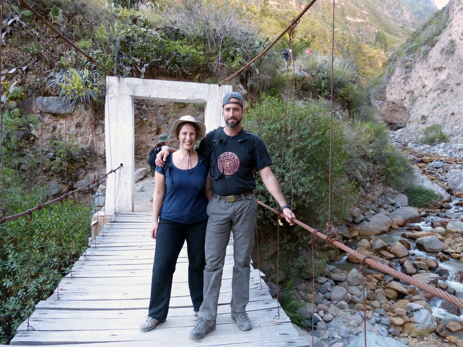 Desde la parte más profunda del cañón, observamos como el sol ya no podía alcanzarnos, dando una imagen curiosa de oscuridad, como si estuviese anocheciendo donde nos hallábamos, pero al levantar la mirada, veíamos la parte alta del precipicio totalmente iluminado. Así, cuando llegamos al Oasis de Sangalle, sobre las 5:45 p.m., en el fondo del cañón, a la altura del río Colca, era noche totalmente cerrada.