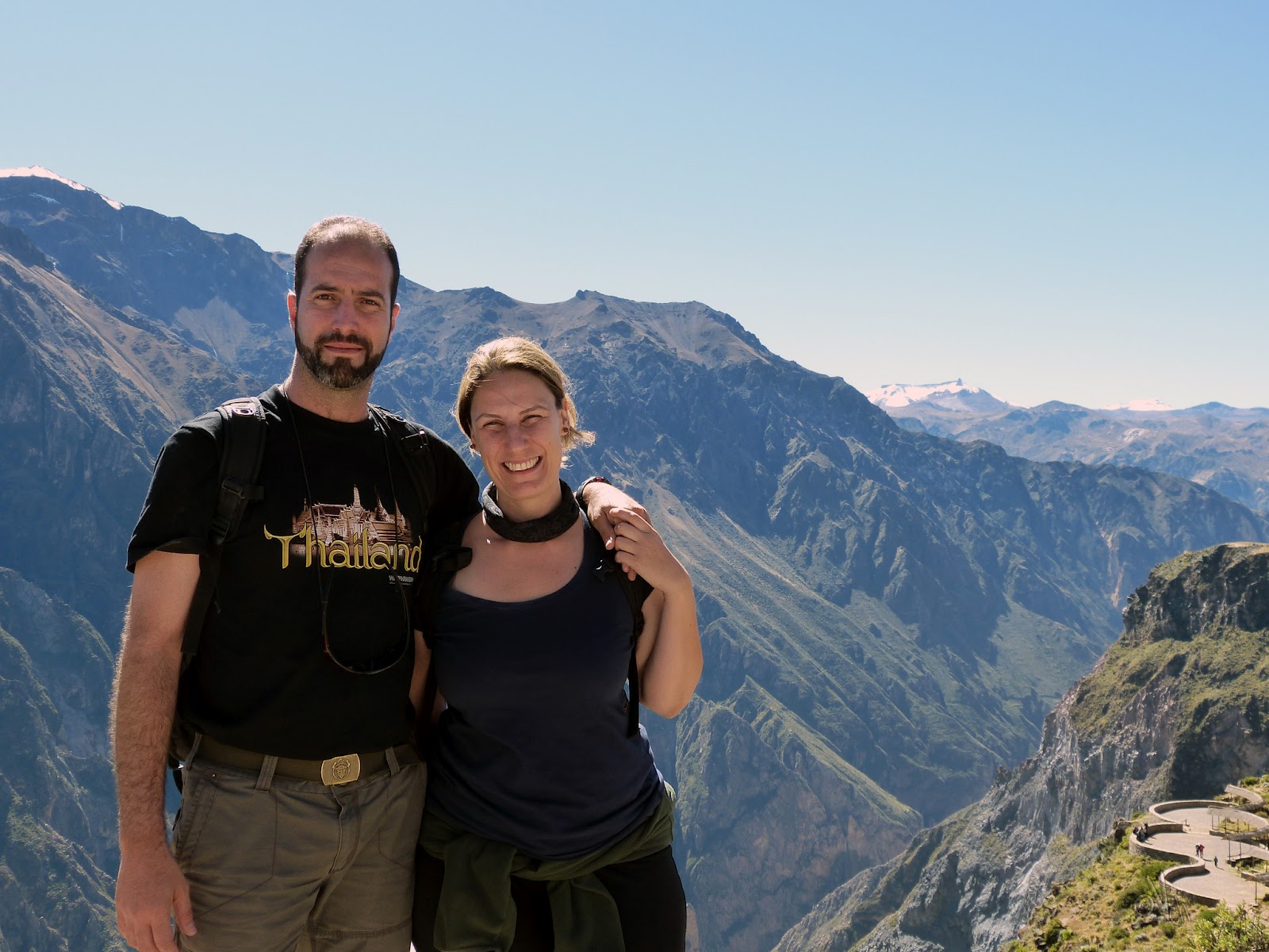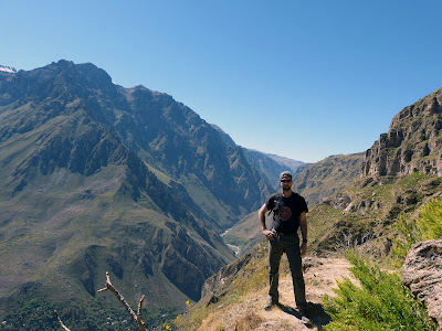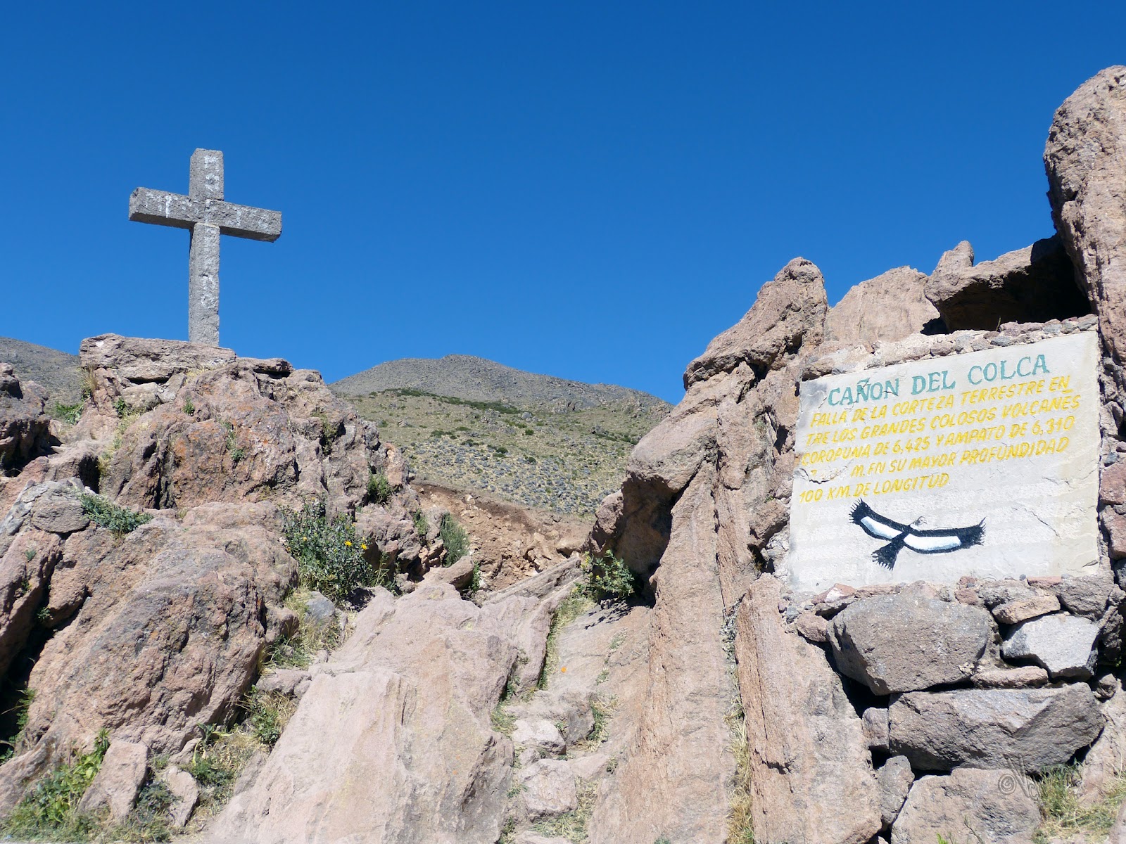 Volvimos a la carretera, que poco a poco, según asomaba el sol, empezó a mostrar a los márgenes del camino el potencial paisajístico del entorno. Ésta, paulatinamente fue dejando el asfalto, cambiándolo por una polvorienta zahorra blanquecina, que nos hacía ir dando incómodos botes dentro de nuestro vehículo, hasta que aproximadamente a las 8:15 a.m. llegamos al famoso Mirador de La Cruz del Cóndor, una de las paradas más famosas y espectaculares en este lugar del mundo, pero el inicial "subidón" de alegría nos iba a durar poco por lo que iba a pasar a continuación.