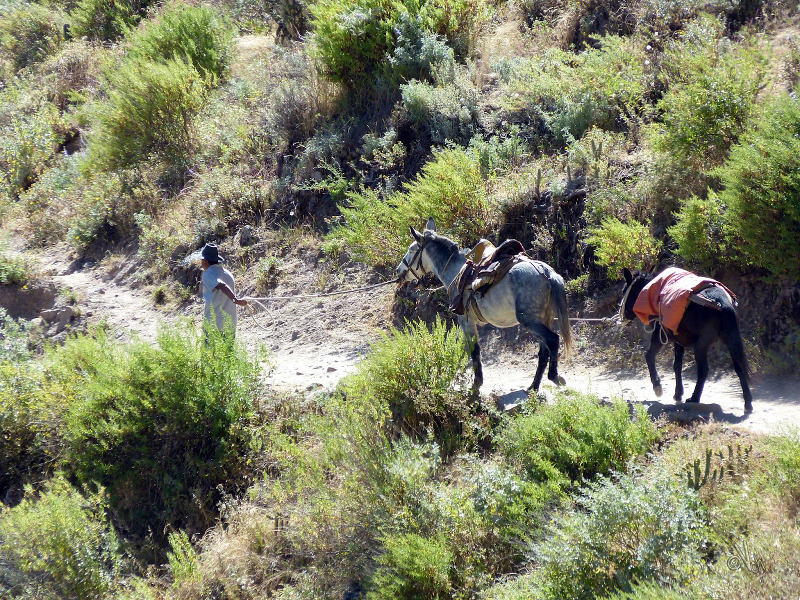 Sobre las 6:15 a.m. ya se podía ascender sin necesidad de la linterna, y empecé a buscar a Mari, mirando abajo, siguiendo el impresionante y zigzagueante sendero en busca de mulas, pero sin éxito, en su lugar un “desparramero”, como decimos en Canarias, de agotados turistas que daba hasta pena verlos.