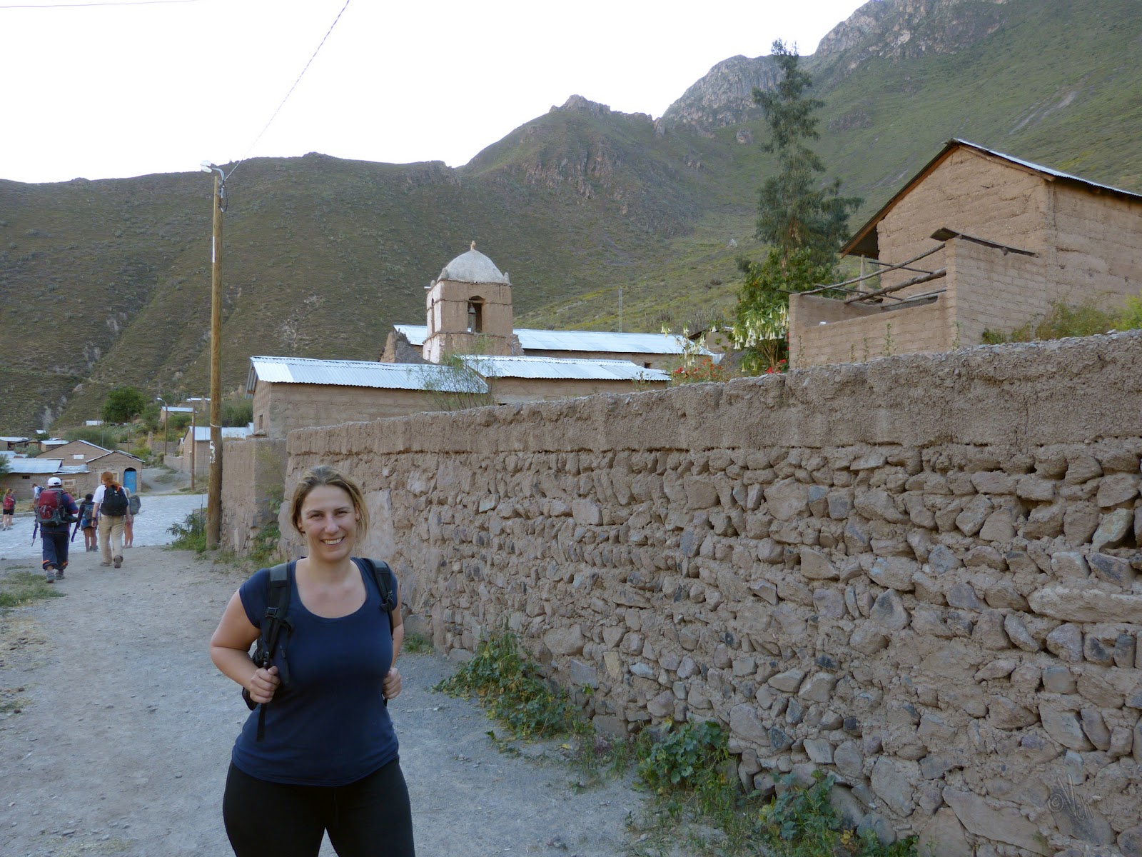 Marijose se reía de mí al verme llegar agotadísimo, pero asombrada al mismo tiempo de que hubiese llegado tan pronto, casi una hora estuvimos esperando a que llegasen Pablo y X, que venía fatal. Después de descansar un rato y recuperarnos algo, comenzamos otra pequeña caminata, de unos 25 minutos, esta vez por terreno llano, aunque siempre con el problema de la altitud y la falta de oxígeno, hasta que llegamos al pueblo de Cabanaconde.