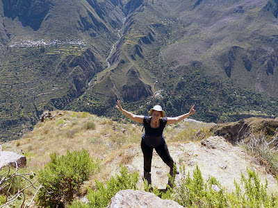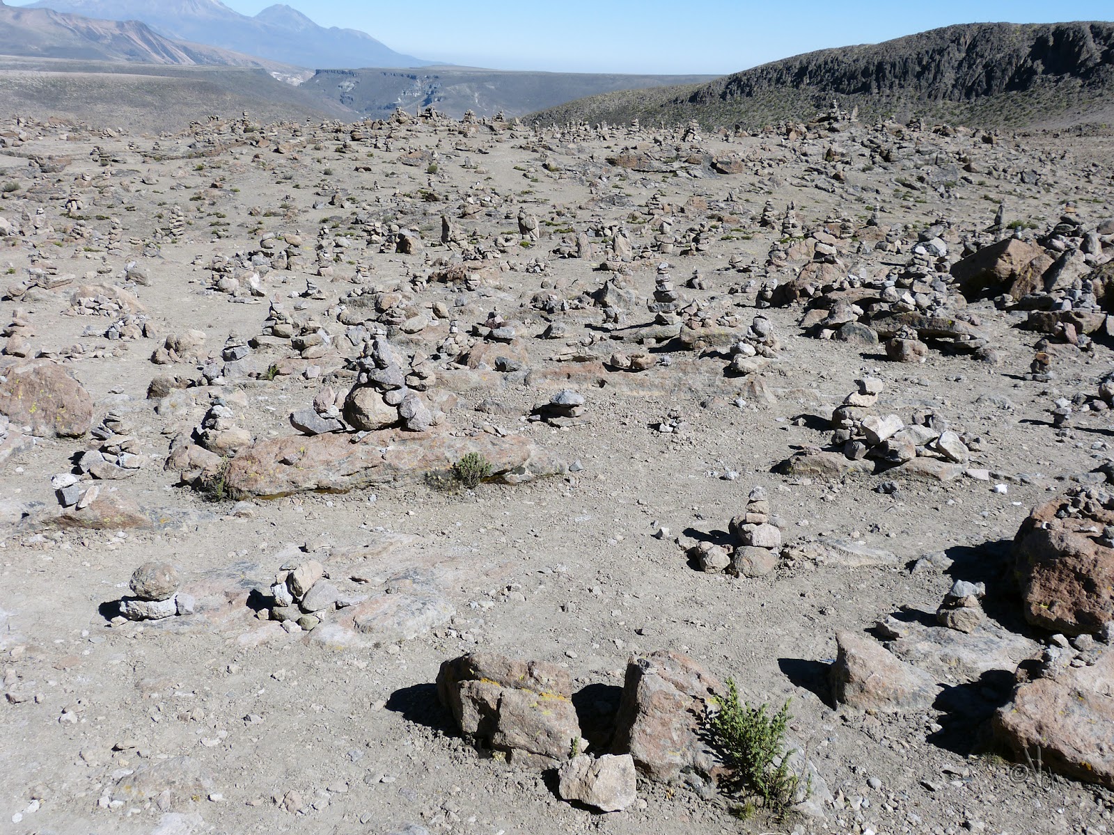 Los otros visitantes en el mirador, corrieron para subirse a las rocas más altas y más cercanas al precipicio, en busca de la mejor posición para contemplar a los cóndores, cuando estos llegaran. Nosotros, nos alejamos un poco de toda esa algarabía y caminamos hasta las terrazas circulares de piedras que hay un poco más abajo, y contemplamos en silencio la impresionante vista que proporciona el majestuoso cañón.