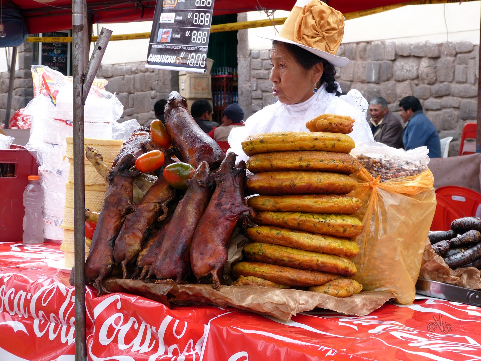 Resultaba muy vistoso y exótico, ver como colocaban a los cuys ya asados (conejillos de india, o curieles en Canarias), de tal forma que parecieran estar vivos, mirándote mientras te enseñaban sus dientitos. Una decepción del plato, fue la tortilla de maíz, que si bien, “te entraba por los ojos” por su color y textura similar a una buena tortilla con cebolla y perejil, solamente tenía sabor a harina de hacer arepas.