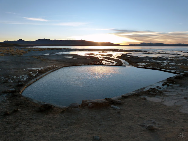 Proseguimos el camino, hasta llegar ya a unas famosas Aguas Termales, donde tienen acondicionada una piscina para que los turistas disfruten del agua caliente que emana la tierra, pero donde hace tanto viento y frío, que solo algunos intrépidos, más bien jovenzuelos alocados, tienen la valentía de bañarse. Como no sentimos ya que tengamos nada que demostrar, no fue nuestro caso…